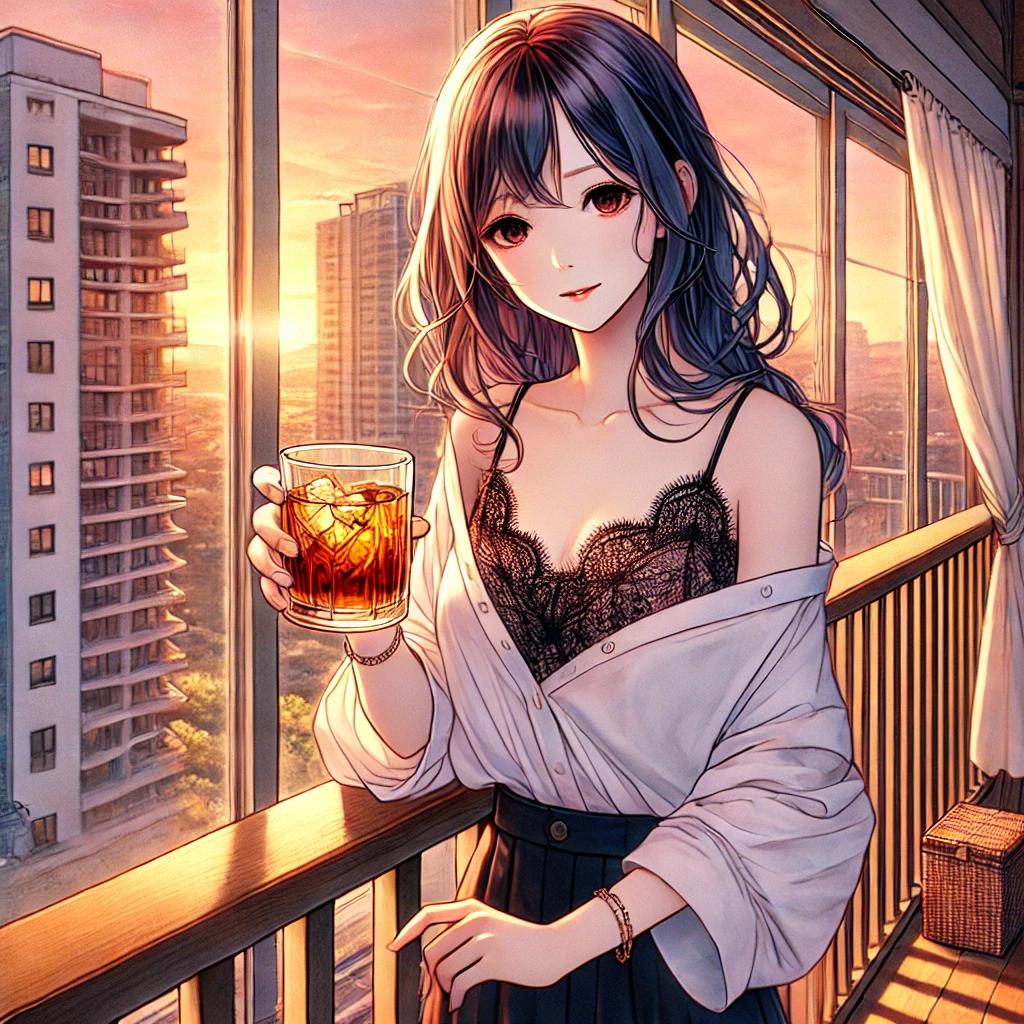 DALL-E作成。バルコニーでウイスキーを飲む女性。