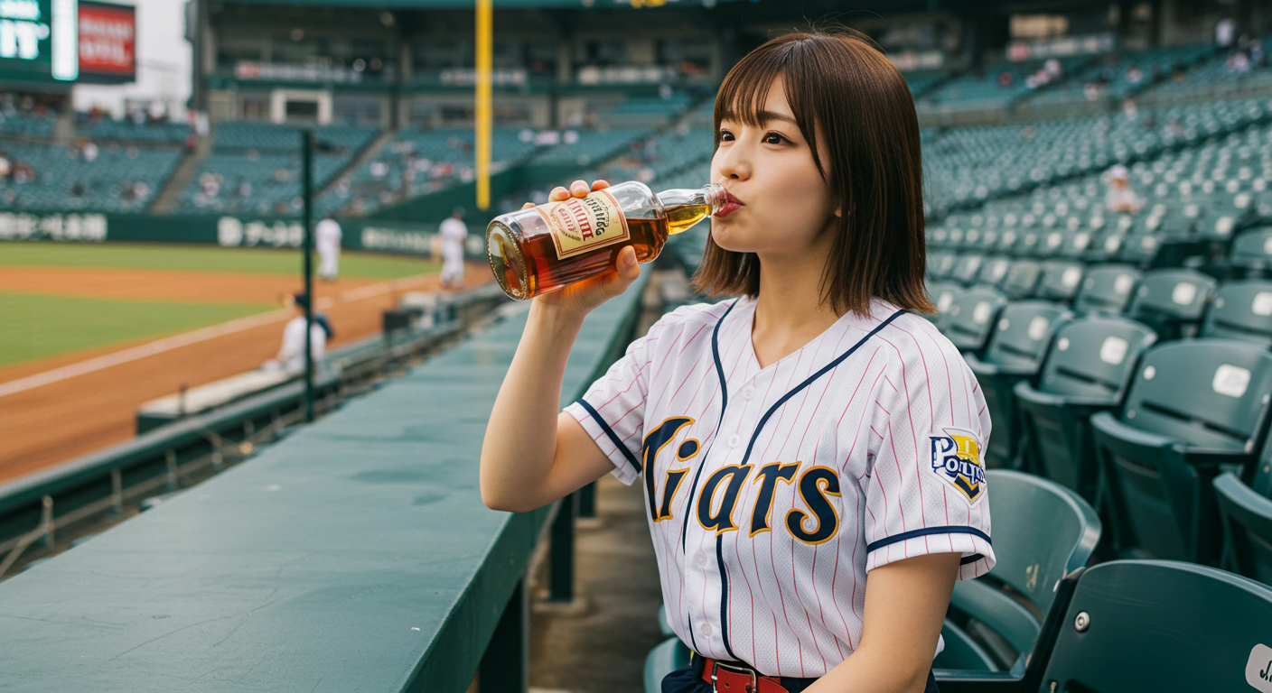 普段、理不尽なデモに晒されストレス解消に贔屓のチームの試合を観に行ったところ、ボロ負けで自棄になってウイスキーをラッパ飲みする財務官僚。