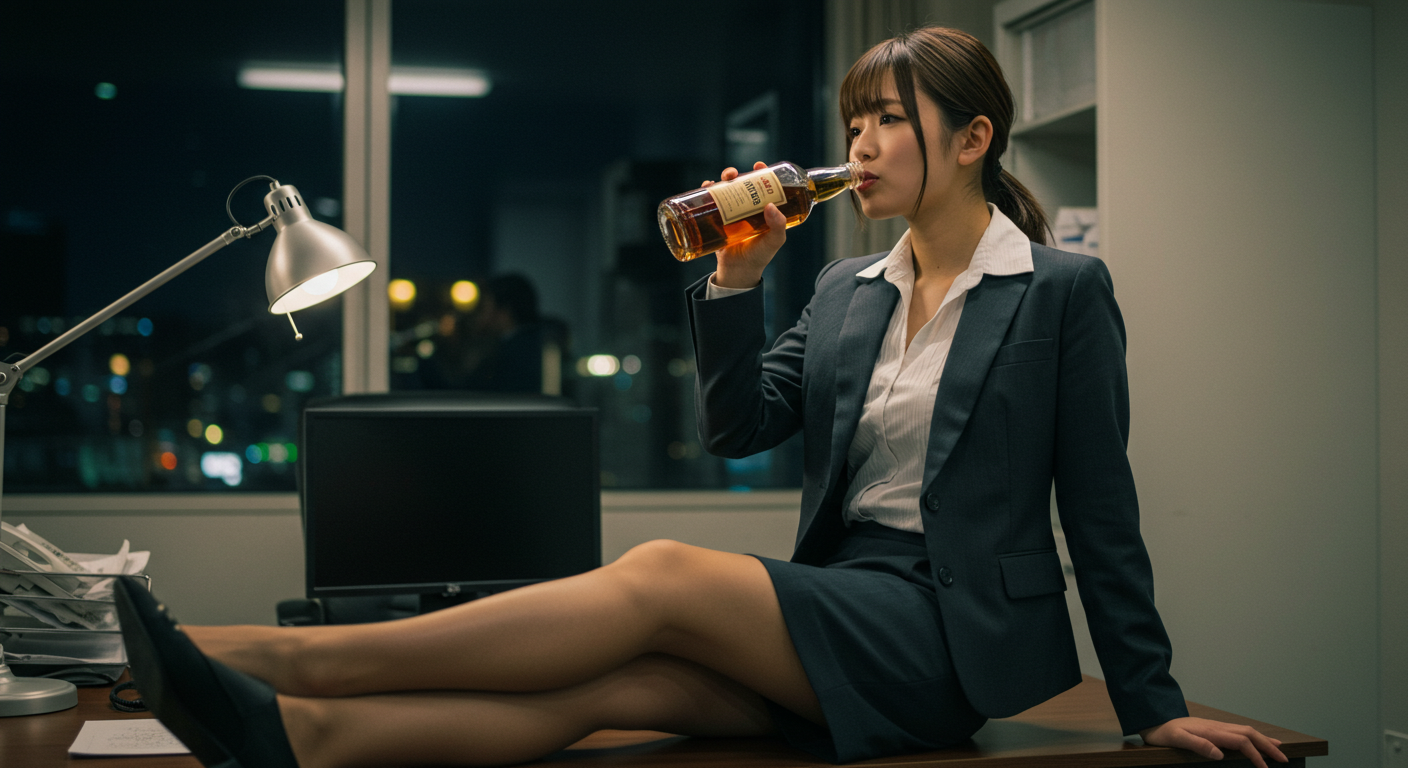 ようやく予算成立したと思ったら、石破茂のバラ撒きで補正予算を組まなければならず、終わらない仕事に疲れ果ててウイスキーをラッパ飲みする財務官僚。