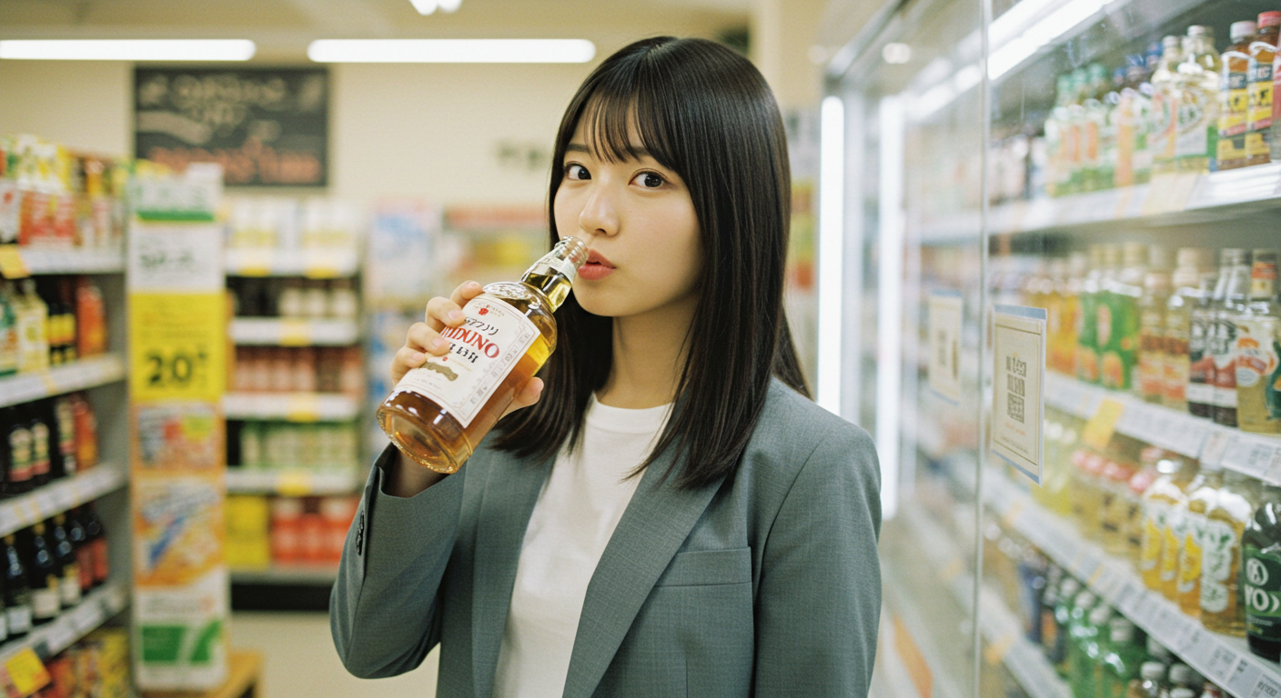 食料品の価格が8 %下がったが、1年後にインフレで食料品の価格が10 %上がり、何が起きているのか理解できずとりあえずウイスキーをラッパ飲みするOL。